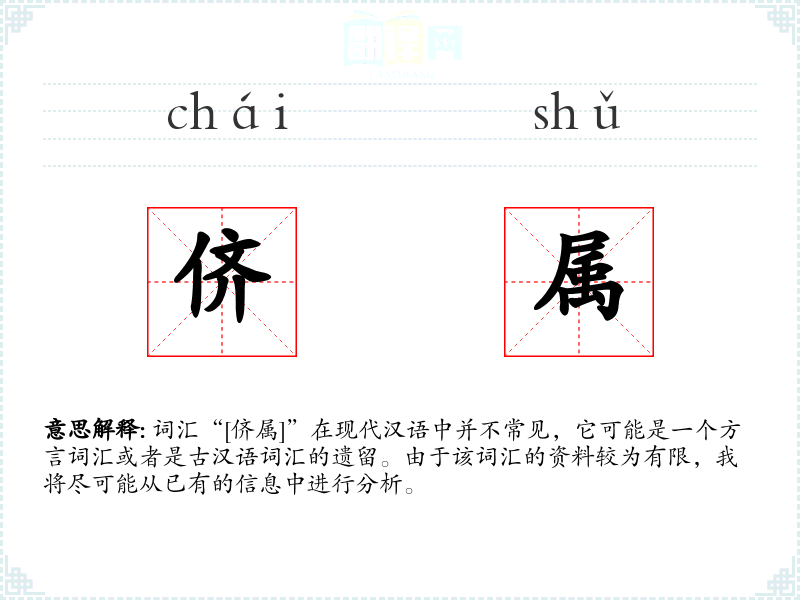 词汇“[侪属]”在现代汉语中并不常见,它可能是一个方言词汇或者是古汉语词汇的遗留。由于该词汇的资料较为有限,我将尽可能从已有的信息中进行分析。