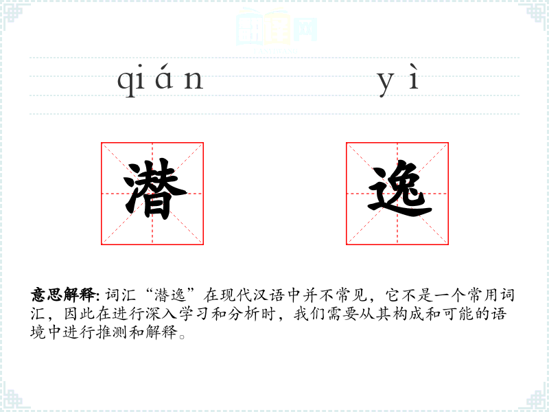 词汇“潜逸”在现代汉语中并不常见,它不是一个常用词汇,因此在进行深入学习和分析时,我们需要从其构成和可能的语境中进行推测和解释。
