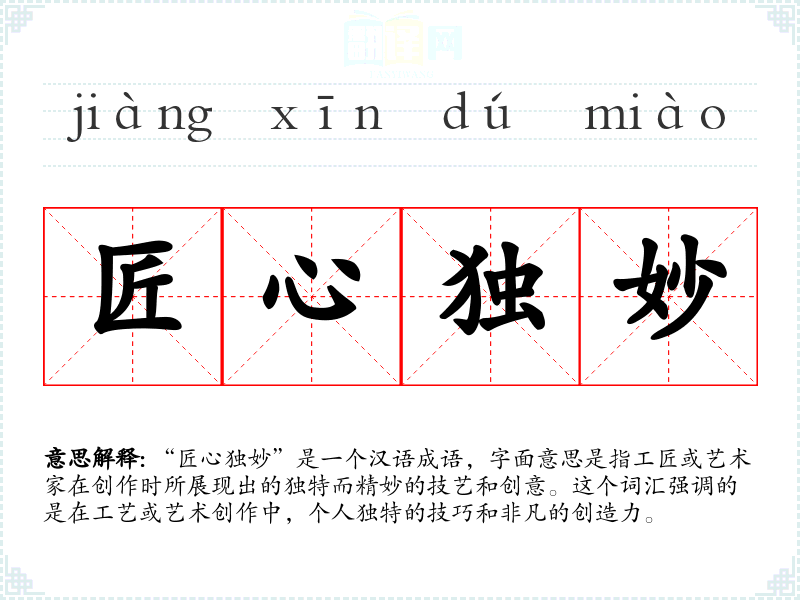 “匠心独妙”是一个汉语成语,字面意思是指工匠或艺术家在创作时所展现出的独特而精妙的技艺和创意。这个词汇强调的是在工艺或艺术创作中,个人独特的技巧和非凡的创造力。