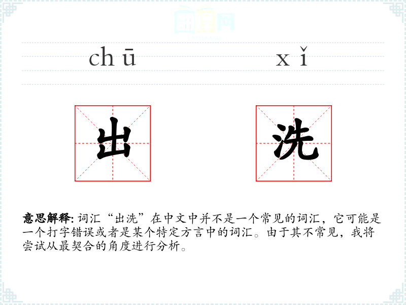 词汇“出洗”在中文中并不是一个常见的词汇,它可能是一个打字错误或者是某个特定方言中的词汇。由于其不常见,我将尝试从最契合的角度进行分析。