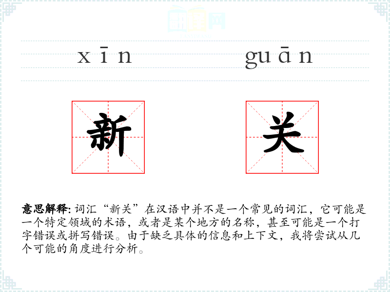 由于“新关”不是一个常见的词汇,对其的理解需要具体的上下文。在语言学习和表达中,了解特定词汇的背景和用法对于准确沟通至关重要。