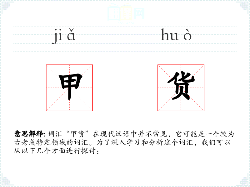 词汇“甲货”在现代汉语中并不常见,它可能是一个较为古老或特定领域的词汇。为了深入学*和分析这个词汇,我们可以从以下几个方面进行探讨: