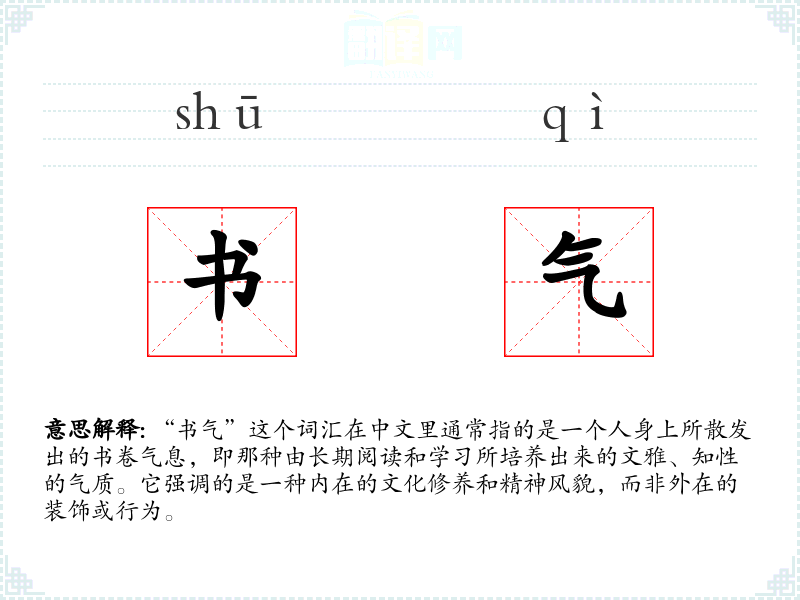 在英语中,与“书气”相对应的词汇可能是“bookish”或“scholarly”,但这两个词在含义上略有不同。“Bookish”有时带有贬义,指过于依赖书本知识而缺乏实际经验;“Scholarly”则更多地强调学术性和研究能力。