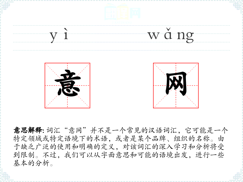 对于“意网”这个词汇,由于其不常见和缺乏明确的定义,深入学习和分析受到限制。然而,从字面意思和可能的语境出发,我们可以进行一些基本的分析,理解它在特定领域或语境中的潜在意义。在语言学习和表达中,了解和掌握特定术语和专有名词的重要性不言而喻,这有助于我们更准确地理解和使用语言。