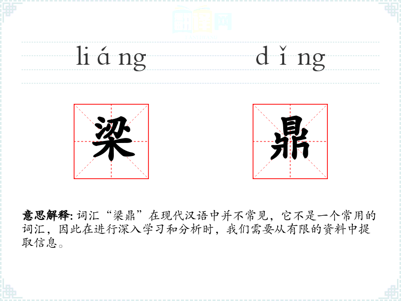 词汇“梁鼎”在现代汉语中并不常见,它不是一个常用的词汇,因此在进行深入学*和分析时,我们需要从有限的资料中提取信息。