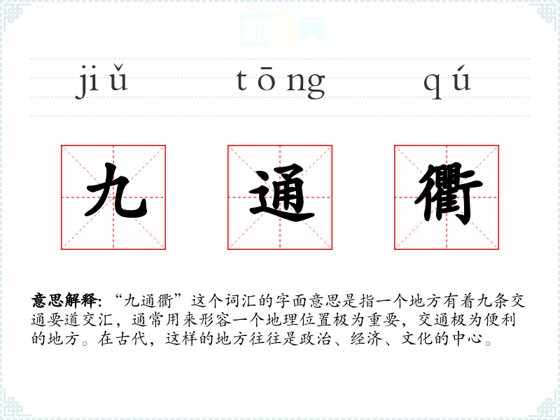 “九通衢”这个词汇的字面意思是指一个地方有着九条交通要道交汇,通常用来形容一个地理位置极为重要,交通极为便利的地方。在古代,这样的地方往往是政治、经济、文化的中心。