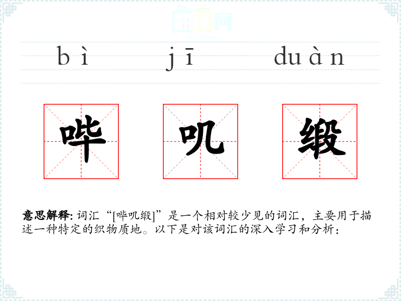 词汇“[哔叽缎]”是一个相对较少见的词汇,主要用于描述一种特定的织物质地。以下是对该词汇的深入学习和分析: