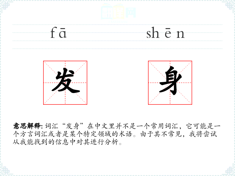 词汇“发身”在中文里并不是一个常用词汇,它可能是一个方言词汇或者是某个特定领域的术语。由于其不常见,我将尝试从我能找到的信息中对其进行分析。