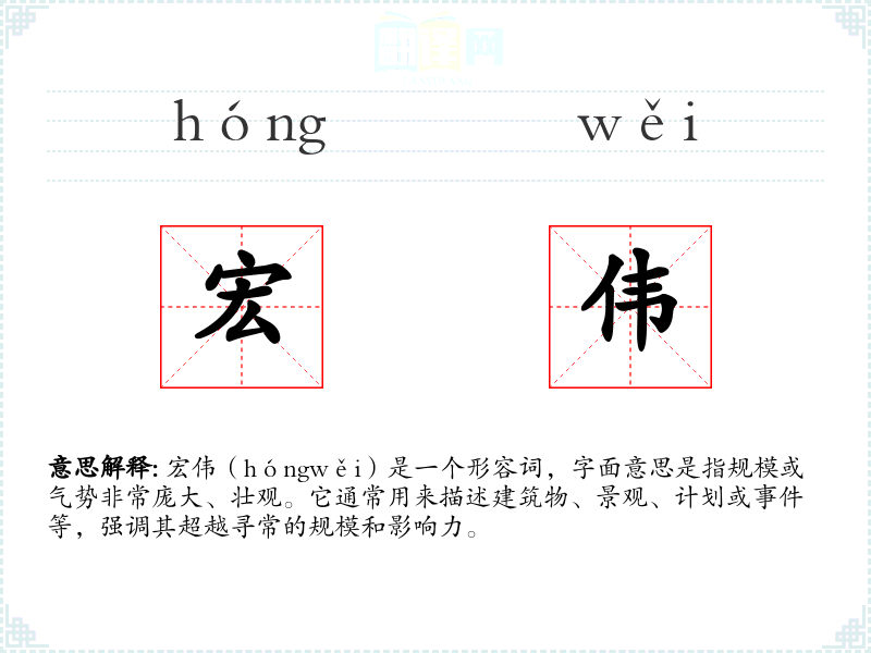 宏伟(hóngwěi)是一个形容词,字面意思是指规模或气势非常庞大、壮观。它通常用来描述建筑物、景观、计划或**等,强调其超越寻常的规模和影响力。