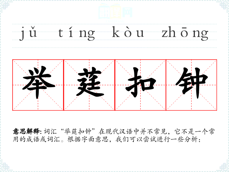 词汇“举莛扣钟”在现代汉语中并不常见,它不是一个常用的成语或词汇。根据字面意思,我们可以尝试进行一些分析: