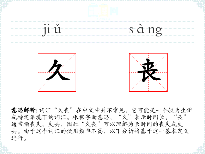 词汇“久丧”在中文中并不常见,它可能是一个较为生僻或特定语境下的词汇。根据字面意思,“久”表示时间长,“丧”通常指丧失、失去,因此“久丧”可以理解为长时间的丧失或失去。由于这个词汇的使用频率不高,以下分析将基于这一基本定义进行。