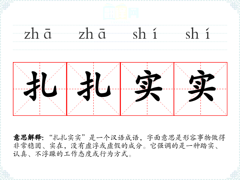 “扎扎实实”是一个汉语成语,字面意思是形容事物做得非常稳固、实在,没有虚浮或虚假的成分。它强调的是一种踏实、认真、不浮躁的工作态度或行为方式。