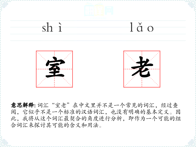 词汇“室老”在中文里并不是一个常见的词汇,经过查阅,它似乎不是一个标准的汉语词汇,也没有明确的基本定义。因此,我将从这个词汇最契合的角度进行分析,即作为一个可能的组合词汇来探讨其可能的含义和用法。