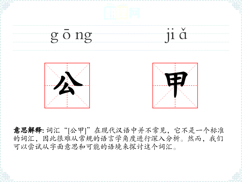 词汇“[公甲]”在现代汉语中并不常见,它不是一个标准的词汇,因此很难从常规的语言学角度进行深入分析。然而,我们可以尝试从字面意思和可能的语境来探讨这个词汇。