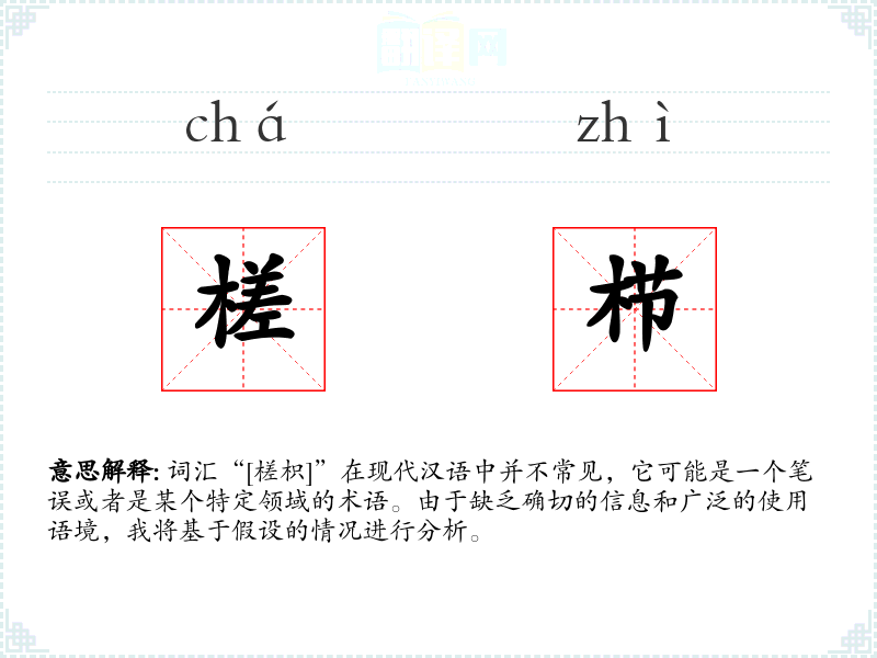 词汇“[槎枳]”在现代汉语中并不常见,它可能是一个笔误或者是某个特定领域的术语。由于缺乏确切的信息和广泛的使用语境,我将基于假设的情况进行分析。