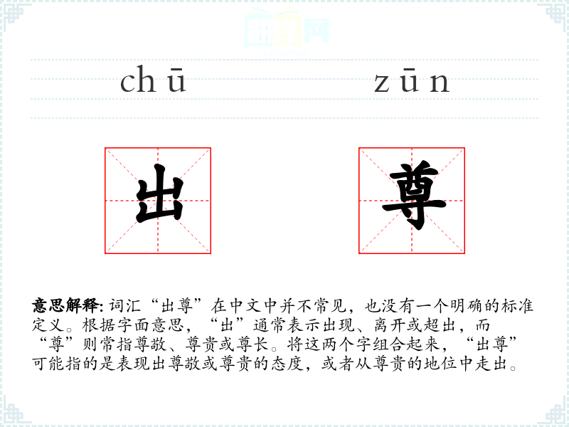 由于“出尊”不是一个常用词汇,其基本含义可能需要根据具体语境来解释。在某些情况下,它可能被用来描述某人从高贵的地位或环境中走出,或者在特定场合表现出尊敬的行为。