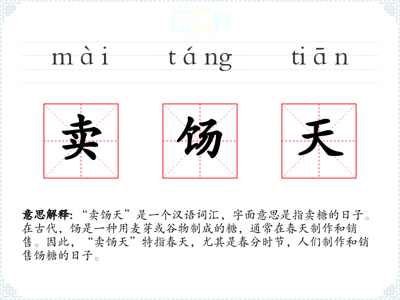 “卖饧天”是一个富有诗意和文化内涵的词汇,它不仅描述了春天的景象,也承载了人们对春天的美好期待和庆祝。在我的语言学*和表达中,理解和运用这样的词汇可以丰富我的语言表达,增加文学和文化的深度。