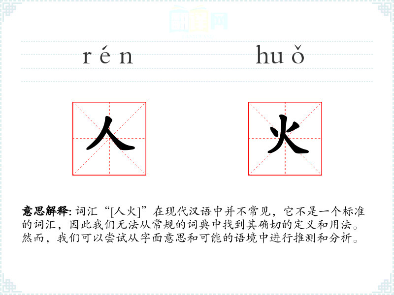 词汇“[人火]”在现代汉语中并不常见,它不是一个标准的词汇,因此我们无法从常规的词典中找到其确切的定义和用法。然而,我们可以尝试从字面意思和可能的语境中进行推测和分析。