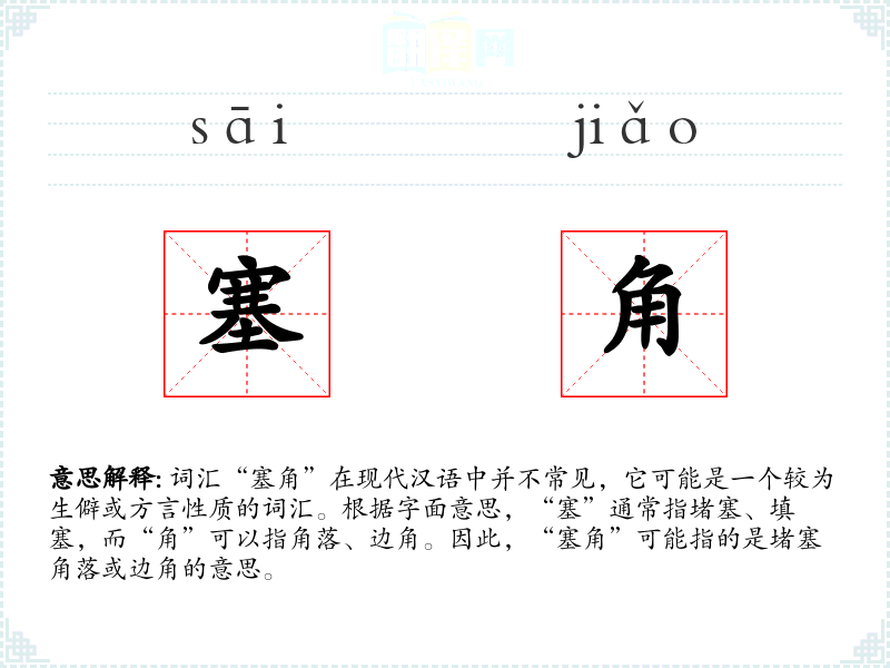 词汇“塞角”在现代汉语中并不常见,它可能是一个较为生僻或方言性质的词汇。根据字面意思,“塞”通常指堵塞、填塞,而“角”可以指角落、边角。因此,“塞角”可能指的是堵塞角落或边角的意思。