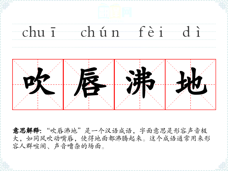“吹唇沸地”是一个汉语成语,字面意思是形容声音极大,如同风吹动嘴唇,使得地面都沸腾起来。这个成语通常用来形容人群喧闹、声音嘈杂的场面。