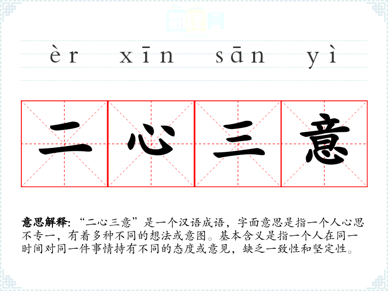 “二心三意”是一个汉语成语,字面意思是指一个人心思不专一,有着多种不同的想法或意图。基本含义是指一个人在同一时间对同一件事情持有不同的态度或意见,缺乏一致性和坚定性。