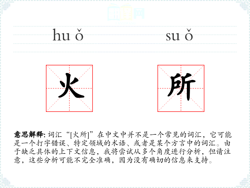 由于“[火所]”不是一个标准词汇,我们对它的理解非常有限。在语言学习和表达中,了解词汇的准确含义和用法是非常重要的,因此,如果遇到不熟悉的词汇,最好是查找可靠的资源来获取准确的信息。
