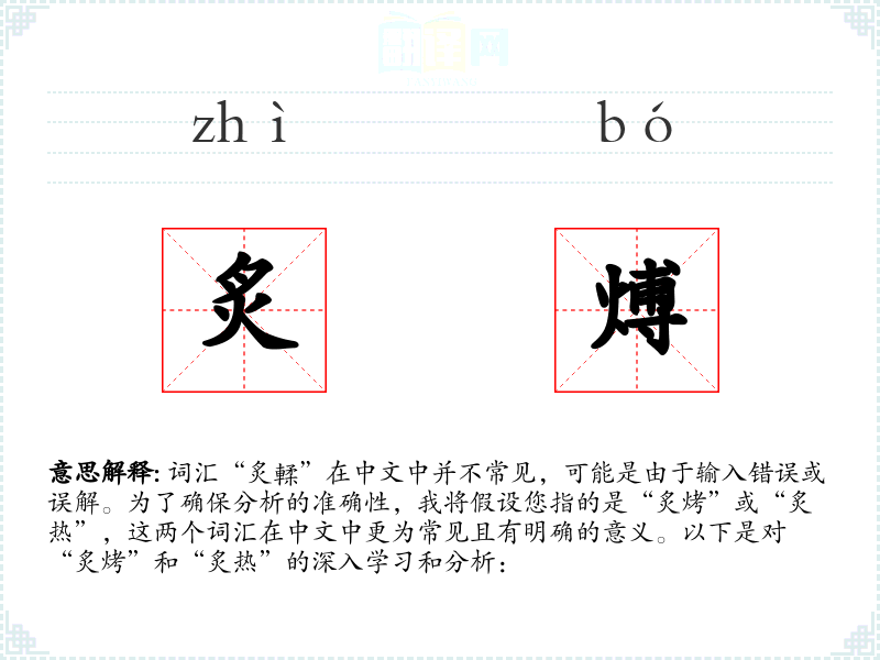 希望这些分析能帮助您更好地理解和使用“炙烤”和“炙热”这两个词汇。如果您确实指的是“炙輮”,请提供更多信息,以便进行准确的分析。