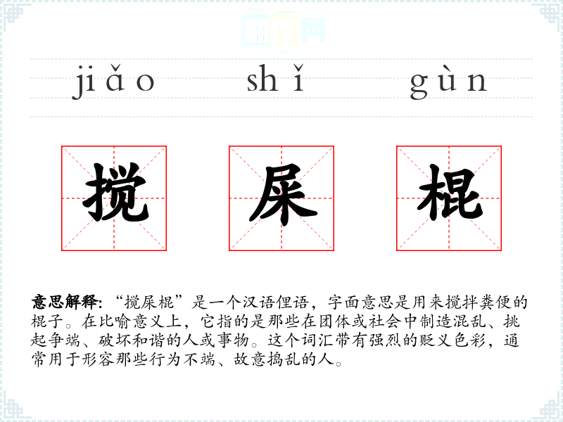 “搅屎棍”是一个汉语俚语,字面意思是用来搅拌粪便的棍子。在比喻意义上,它指的是那些在团体或社会中制造混乱、挑起争端、破坏和谐的人或事物。这个词汇带有强烈的贬义色彩,通常用于形容那些行为不端、故意捣乱的人。