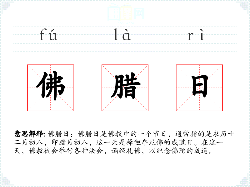 佛腊日:佛腊日是中的一个节日,通常指的是农历十二月初八,即腊月初八,这一天是释迦牟尼佛的成道日。在这一天,徒会举行各种法会,诵经礼佛,以纪念佛陀的成道。