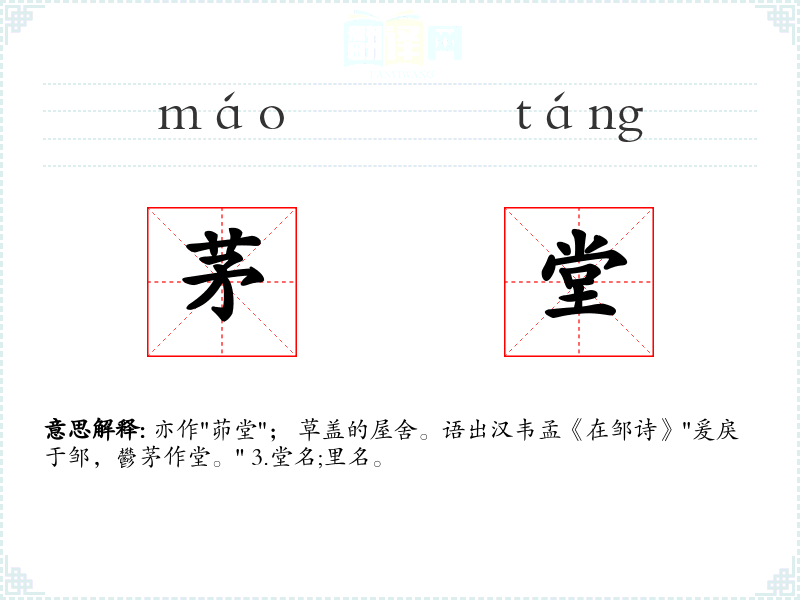 亦作"茆堂"; 草盖的屋舍。语出汉韦孟《在邹诗》"爰戾于邹,鬰茅作堂。" 3.堂名;里名。