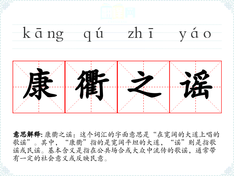 康衢之谣:这个词汇的字面意思是“在宽阔的大道上唱的歌谣”。其中,“康衢”指的是宽阔平坦的大道,“谣”则是指歌谣或民谣。基本含义是指在公共场合或大众中流传的歌谣,通常带有一定的社会意义或反映民意。