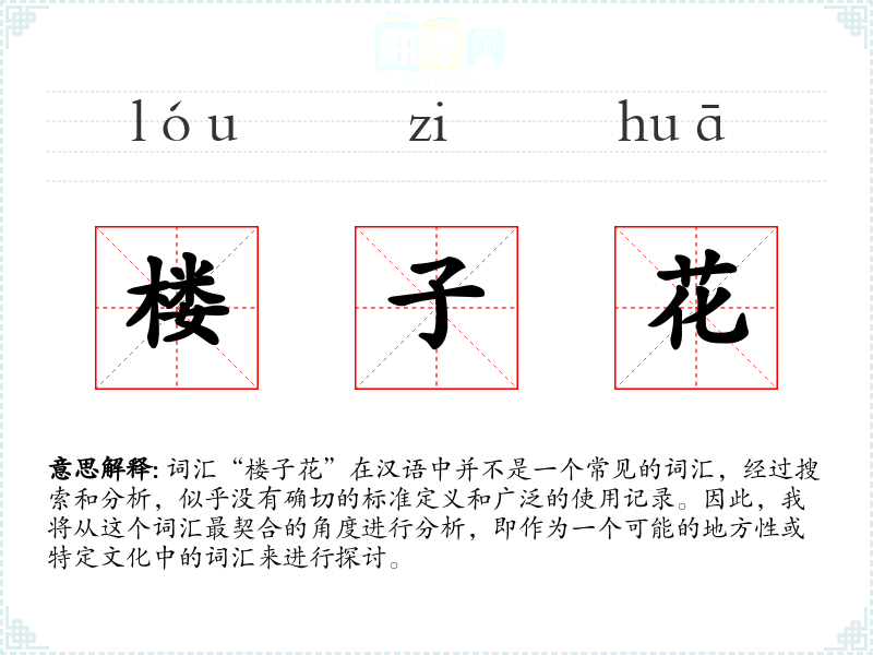 由于“楼子花”不是一个标准词汇,我们无法给出一个确切的基本定义。它可能是某个地区或文化中对某种花的俗称,或者是某个特定植物的别名。