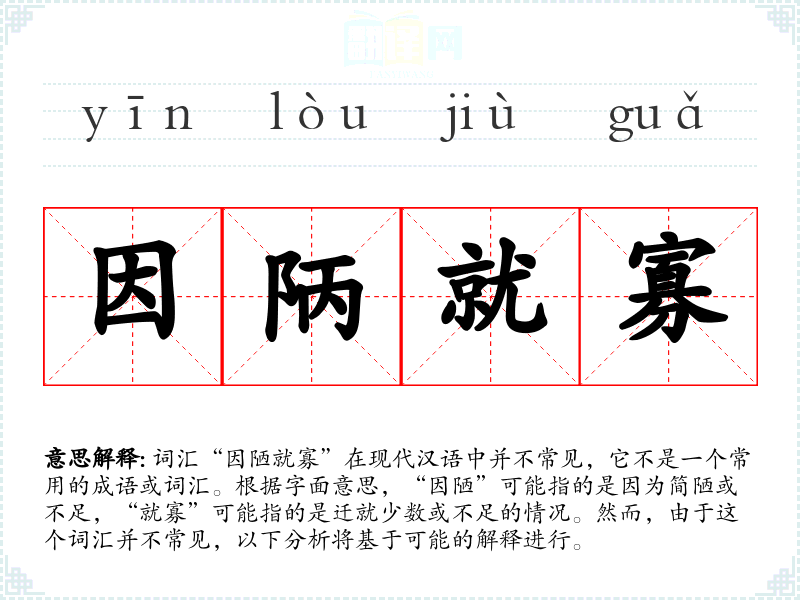 词汇“因陋就寡”在现代汉语中并不常见,它不是一个常用的成语或词汇。根据字面意思,“因陋”可能指的是因为简陋或不足,“就寡”可能指的是迁就少数或不足的情况。然而,由于这个词汇并不常见,以下分析将基于可能的解释进行。