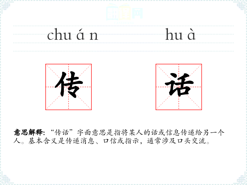 “传话”字面意思是指将某人的话或信息传递给另一个人。基本含义是传递消息、口信或指示,通常涉及口头交流。