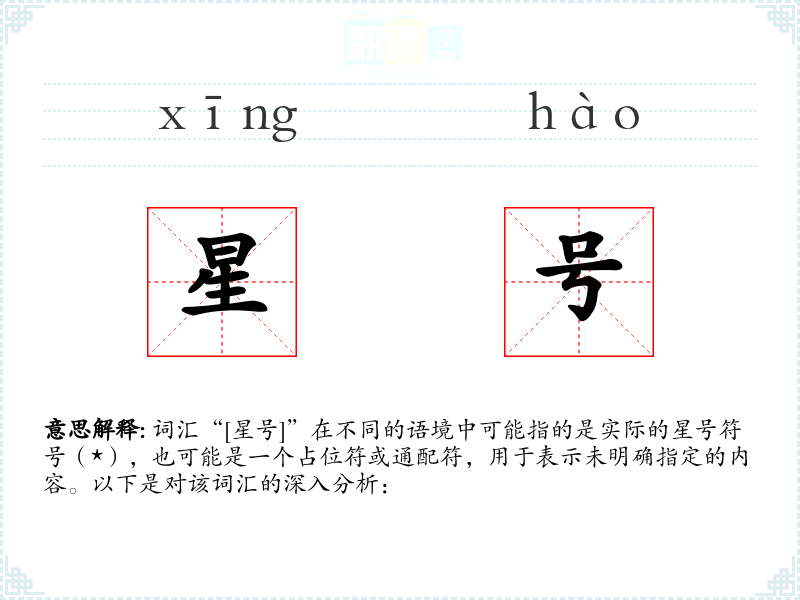 词汇“[星号]”在不同的语境中可能指的是实际的星号符号(*),也可能是一个占位符或通配符,用于表示未明确指定的内容。以下是对该词汇的深入分析: