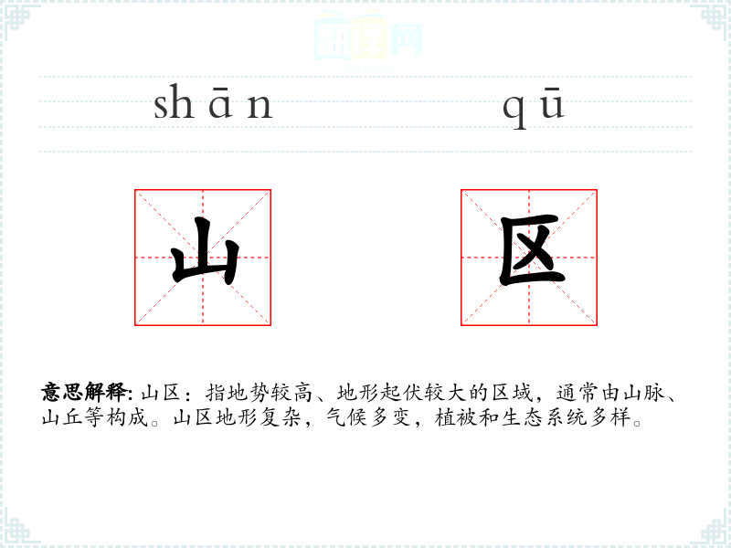 山区一词由“山”和“区”组成,“山”指地势较高的地形,“区”指区域或范围。在古代汉语中,“山”和“区”分别有各自的意义,现代汉语中结合使用,形成“山区”这一词汇。