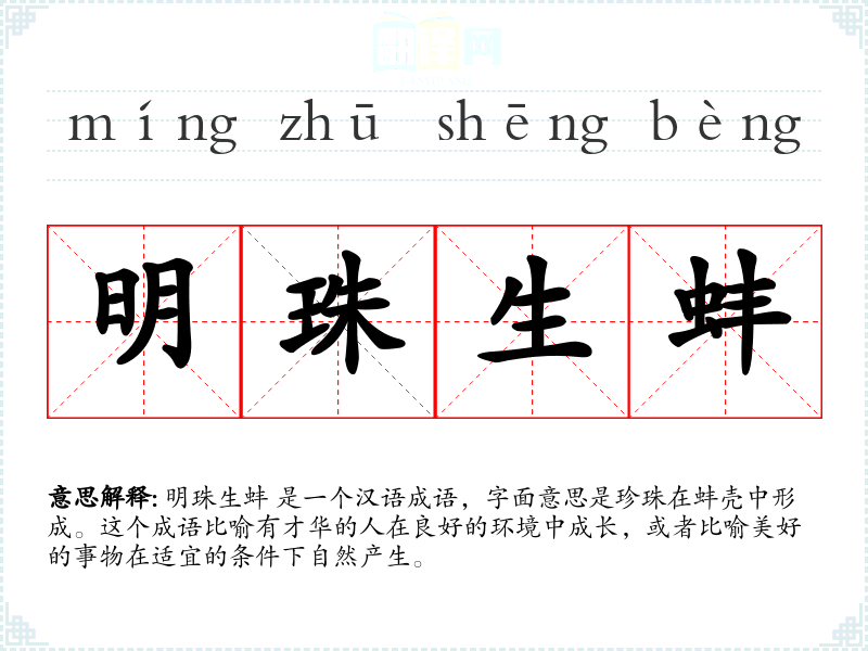 明珠生蚌 是一个汉语成语,字面意思是珍珠在蚌壳中形成。这个成语比喻有才华的人在良好的环境中成长,或者比喻美好的事物在适宜的条件下自然产生。