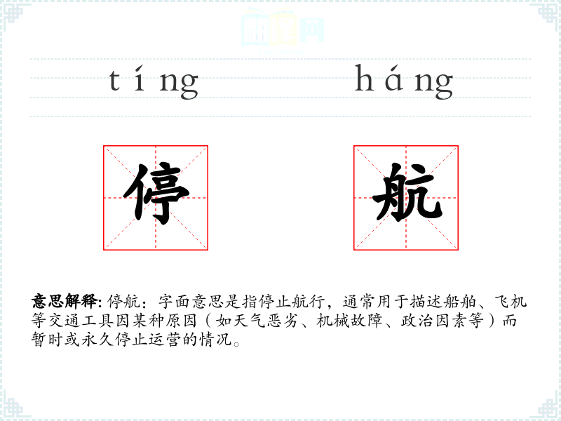 停航:字面意思是指停止航行,通常用于描述船舶、飞机等交通工具因某种原因(如天气恶劣、机械故障、政治因素等)而暂时或永久停止运营的情况。