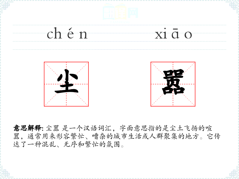 尘嚣 是一个汉语词汇,字面意思指的是尘土飞扬的喧嚣,通常用来形容繁忙、嘈杂的城市生活或人群聚集的地方。它传达了一种混乱、无序和繁忙的氛围。