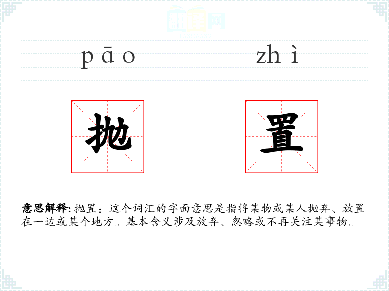 抛置:这个词汇的字面意思是指将某物或某人抛弃、放置在一边或某个地方。基本含义涉及放弃、忽略或不再关注某事物。