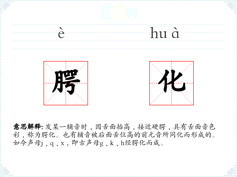 发某一辅音时﹐因舌面抬高﹐接近硬腭﹐具有舌面音色彩﹐称为腭化。也有辅音被后面舌位高的前元音所同化而形成的。如今声母j﹑q﹑x﹐即古声母g﹑k﹑h经腭化而成。