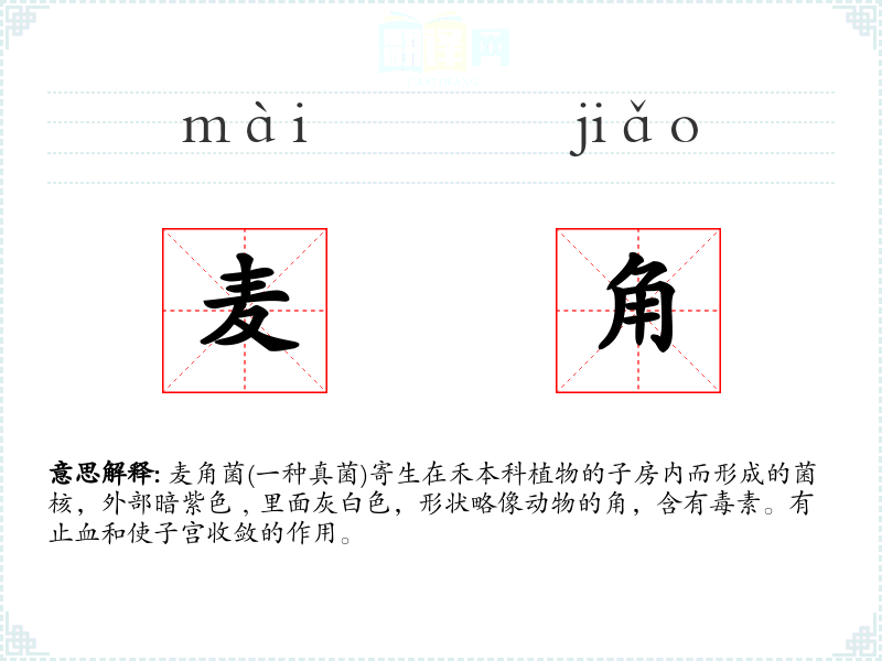 麦角菌(一种真菌)寄生在禾本科植物的子房内而形成的菌核,外部暗紫色﹐里面灰白色,形状略像动物的角,含有毒素。有止血和使子宫收敛的作用。