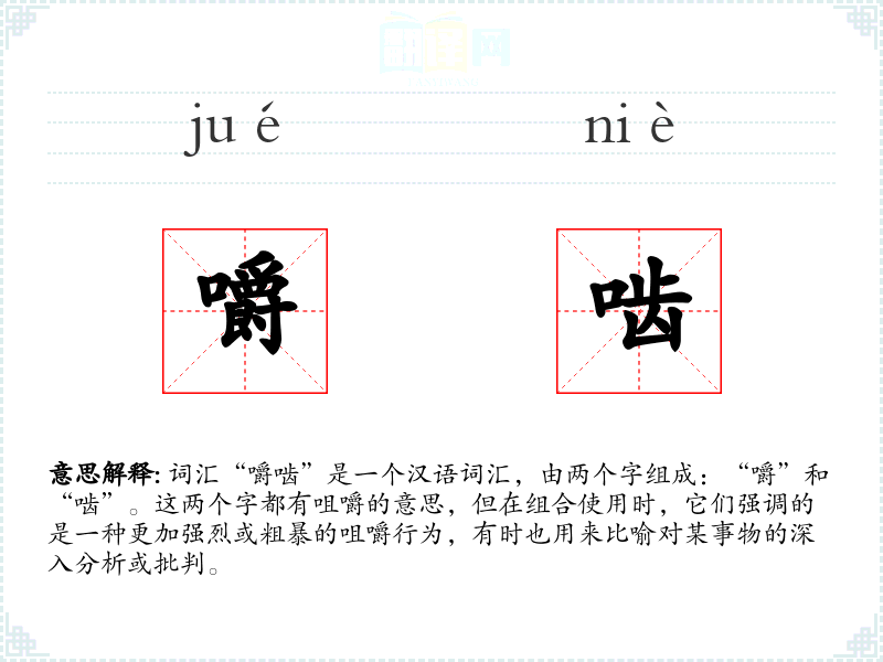 词汇“嚼啮”是一个汉语词汇,由两个字组成:“嚼”和“啮”。这两个字都有咀嚼的意思,但在组合使用时,它们强调的是一种更加强烈或粗暴的咀嚼行为,有时也用来比喻对某事物的深入分析或批判。