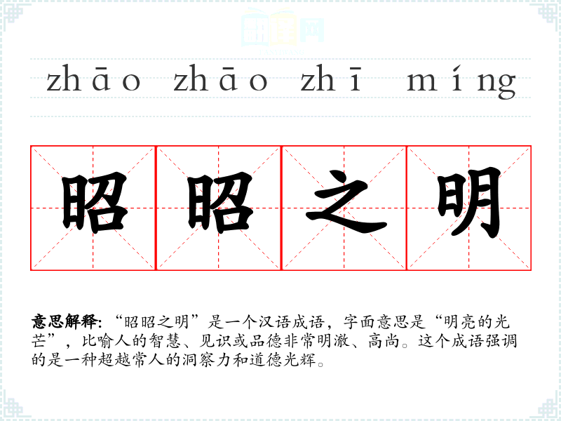 “昭昭之明”是一个汉语成语,字面意思是“明亮的光芒”,比喻人的智慧、见识或品德非常明澈、高尚。这个成语强调的是一种超越常人的洞察力和道德光辉。