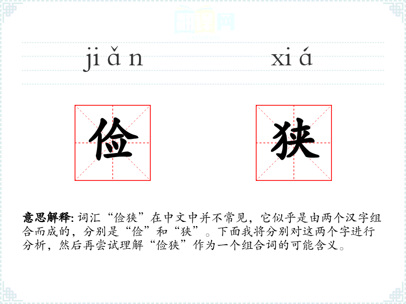词汇“俭狭”在中文中并不常见,它似乎是由两个汉字组合而成的,分别是“俭”和“狭”。下面我将分别对这两个字进行分析,然后再尝试理解“俭狭”作为一个组合词的可能含义。