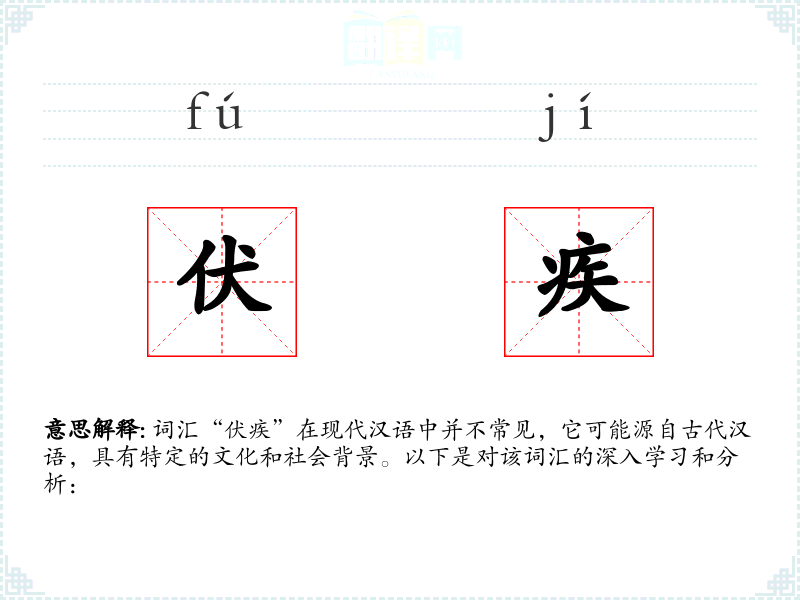 词汇“伏疾”在现代汉语中并不常见,它可能源自古代汉语,具有特定的文化和社会背景。以下是对该词汇的深入学*和分析: