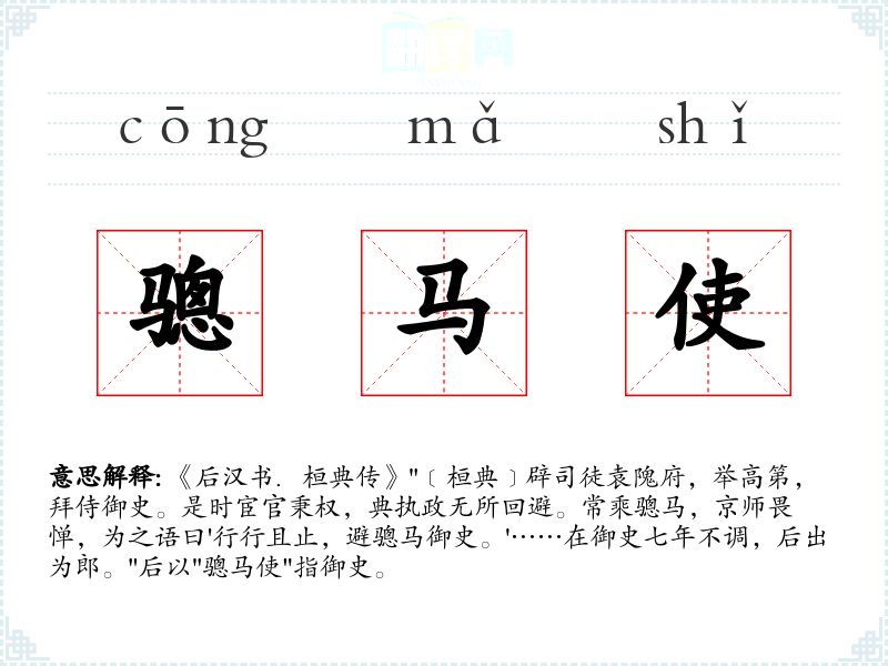 1.《后汉书.桓典传》"﹝桓典﹞辟司徒袁隗府,举高第,拜侍御史。是时宦官秉权,典执政无所回避。常乘骢马,京师畏惮,为之语曰'行行且止,避骢马御史。'……在御史七年不调,后出为郎。"后以"骢马使"指御史。