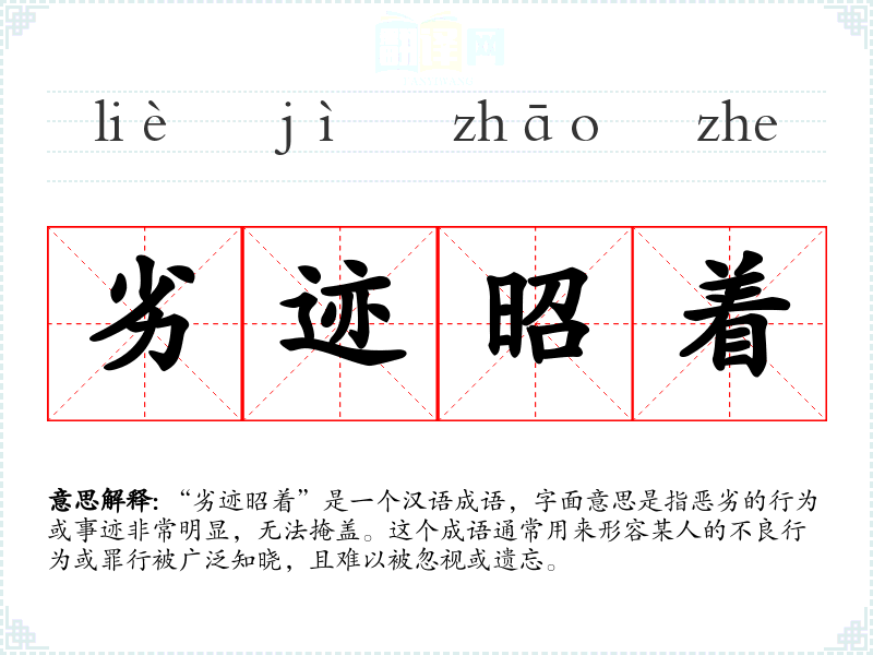 “劣迹昭着”是一个汉语成语,字面意思是指恶劣的行为或事迹非常明显,无法掩盖。这个成语通常用来形容某人的不良行为或罪行被广泛知晓,且难以被忽视或遗忘。