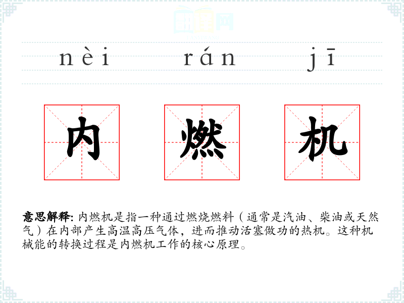 - 反义词:电动机(电动机通过电能转换为机械能,与内燃机的能量转换方式不同)