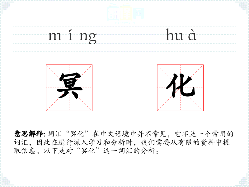 词汇“冥化”在中文语境中并不常见,它不是一个常用的词汇,因此在进行深入学*和分析时,我们需要从有限的资料中提取信息。以下是对“冥化”这一词汇的分析: